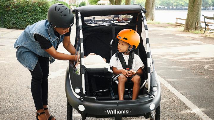 The kickstand at the front ensures that children can easily and safely enter and exit the cabin without the adult having to counterbalance the cargo bike.